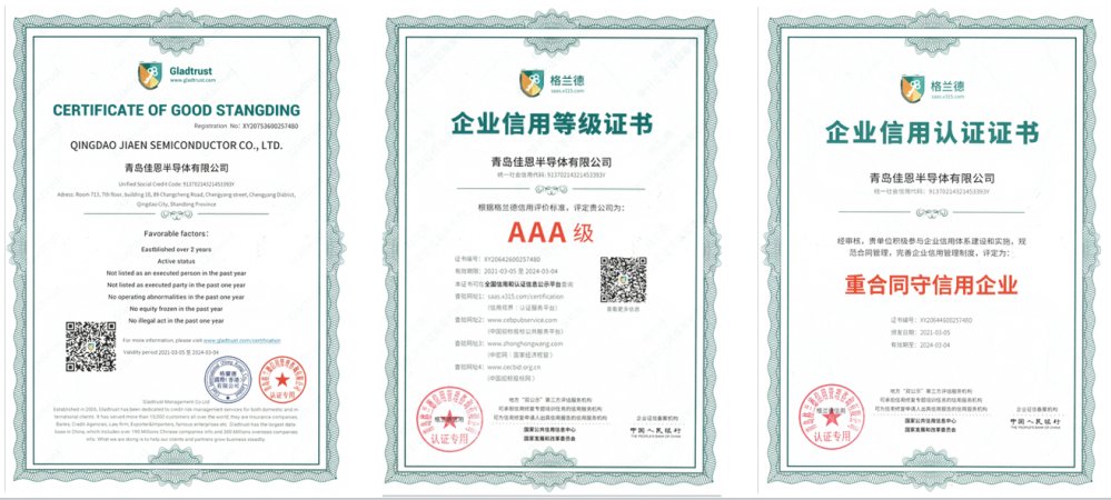 2020年3月,经过中国招标投标网、中国招标投标公共服务平台、中宏网、第三方信用认证机构格兰德信用评价认证中心的严格审核,青岛佳恩半导体有限公司荣获"AAA级企业信用等级"证书,这标志着青岛佳恩半导体有限公司在规范运营、诚信经营上得到了国家相关部门及权威机构的认可。