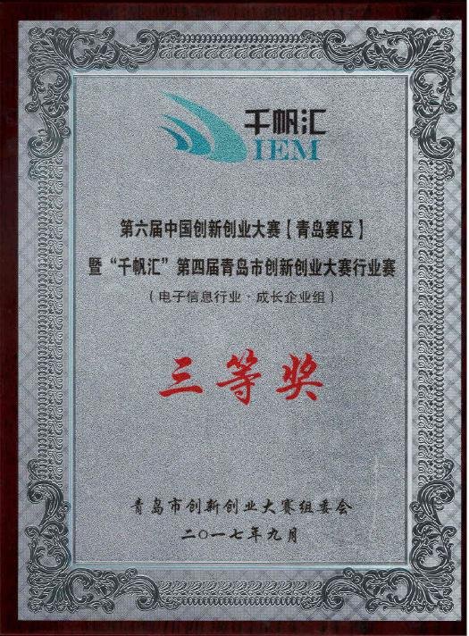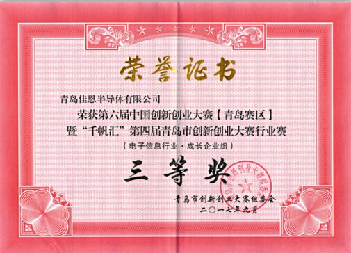 2017.8.4日,第六届中国创新创业大赛[青岛赛区]暨“千帆汇”第四届青岛市创新创业大赛完美落幕,由王丕龙、徐旭、王新强带领青岛佳恩半导体再创战绩,荣获企业组电子信息项三等奖。