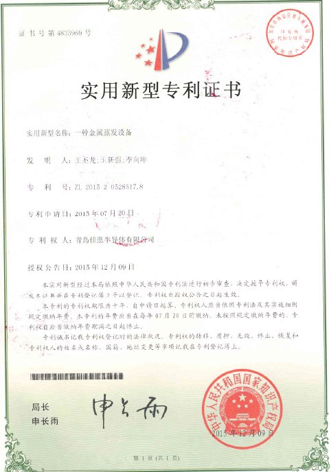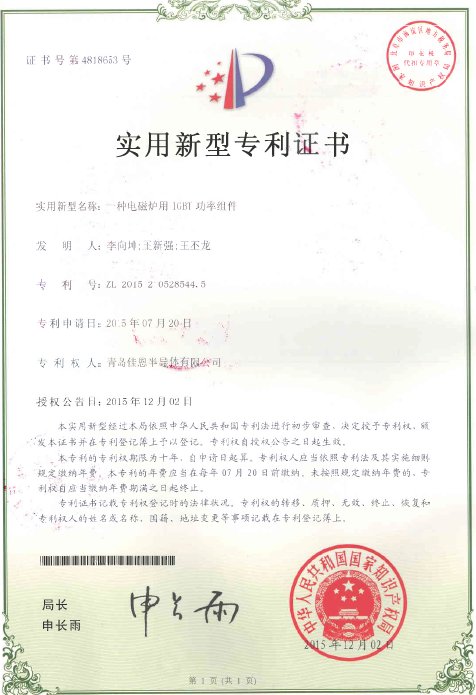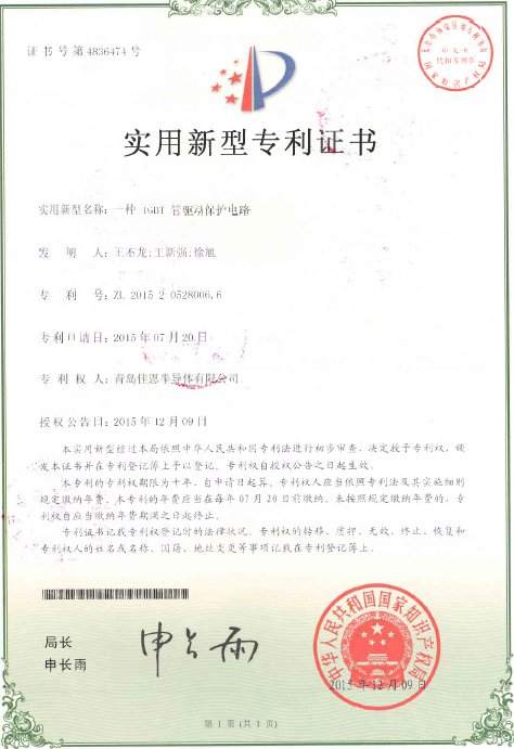 青岛佳恩半导体有限公司小波实用新型专利证书已到位,大批专利证书正在路上!