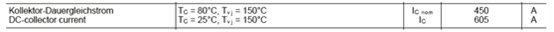 The maximum DC current flowing through the collector-emitter within the usable junction temperature range. According to the definition of the maximum power dissipation, the maximum allowable collector current can be calculated by the formula of Ptot. Thus in order to give the rated current of a module, the corresponding junction and case temperatures must be specified, as shown in the figure below. Note that current ratings are meaningless without specifying temperature conditions.